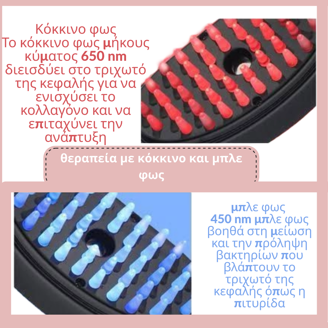 🔴 Κόκκινο φως (650nm): Ενισχύει την κυκλοφορία του αίματος, διεγείρει την παραγωγή κολλαγόνου και υποστηρίζει την υγεία των θυλάκων των τριχών—προάγοντας πιο δυνατή, πλούσια και υγιή ανάπτυξη των μαλλιών με την πάροδο του χρόνου.